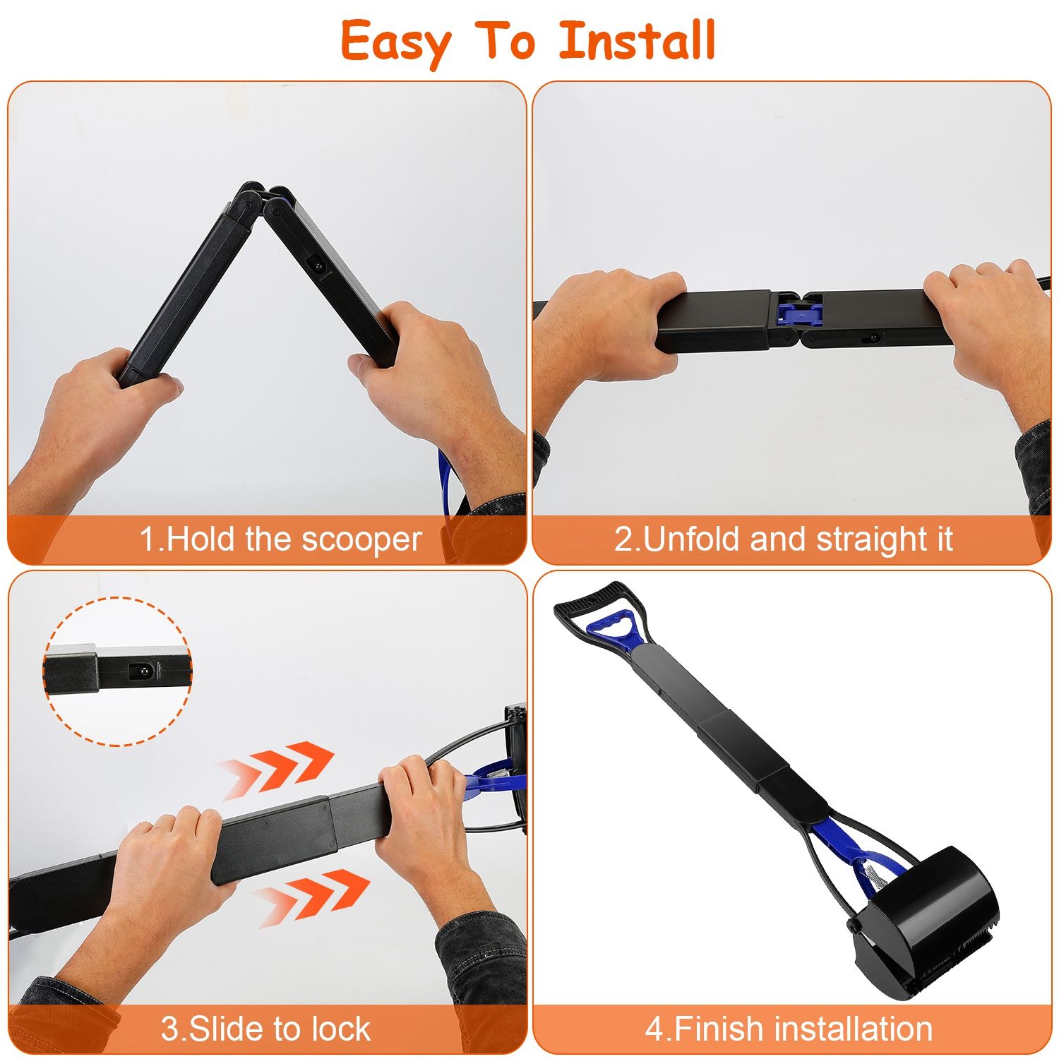 1.Simply unfold and slide to lock the pooper scooper